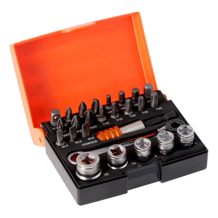 Kirjeldus / Bahco bitide ja padrunite komplekt – 26 osa, 1/4" kuuskant, legeerteras, tsingitud ja kroomitud, ratchet ja adapteriga