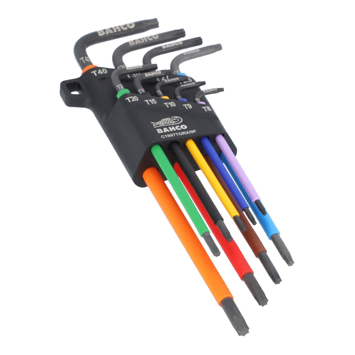 Bahco L-Torx võtmete komplekt – 9 tk T8–T40, pikk vars, värvikoodid, fosfaatviimistlus, pehme käepidemega hoidik