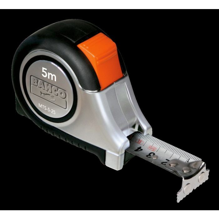 Bahco mõõdulint MTS-5-25 – roostevaba teras, kahepoolne skaala, magnetots, 5 m, 25 mm, kummist korpus