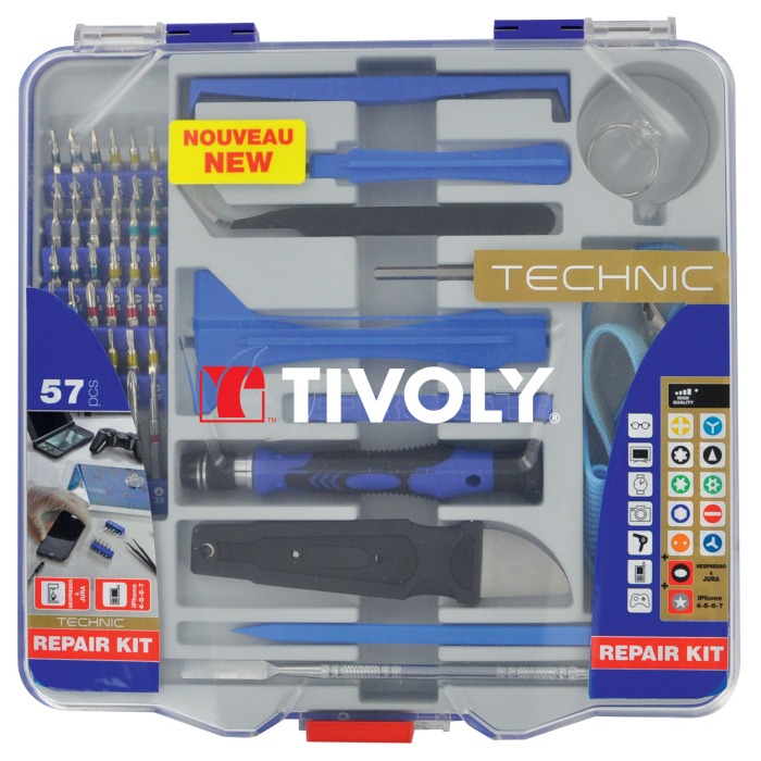 See 57-osaline Tivoly avamiskomplekt sisaldab kõiki vajalikke tööriistu nutitelefonide ja tahvelarvutite turvaliseks avamiseks. Komplektis on täppisterad Pentalobe (0,8; 1,2; 1,5; 2 mm), Phillips (PH000–PH1), slotted (SL1,5–2,5 mm), Torx (TX3–TX10), turvakruvi Torx (TX6–TX10), Gamebit (3,8 & 4,5 mm), Tri-point, Tri-wing, Nespresso ja U-otsikud, lisaks antistaatiline randmerihm, iminapp, avamisvardad, pintsetid, spaatel, tera, magneetiline otsikuhoidja, pikendusadapter ning muud eemaldamistööriistad. Kõik on paigutatud vastupidavasse RANGER karpi organiseeritud hoiustamiseks ja mugavaks transportimiseks.