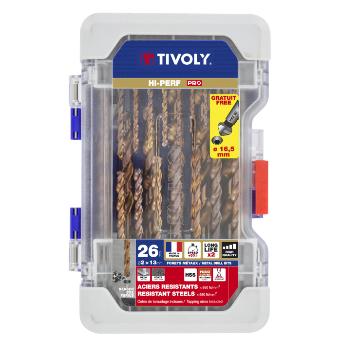 Tivoly FURIUS FUSIO metallipuuride ja süvistite komplekt – 26-osaline Ø2–13 mm "split point" HSS, FUSIO kattega, 135° tipp, 30° N-spiraaliga, RANGER karp