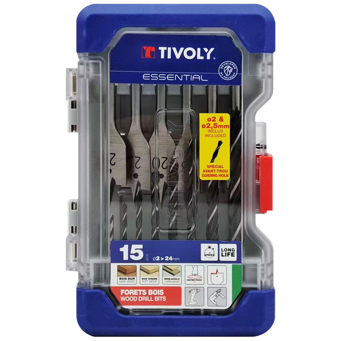Kirjeldus / Tivoly puidupuuride komplekt – 15-osaline, Ø2–24mm, kolmiktipuga ja lamedad puurid, RANGER karp